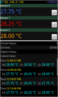 This is an Android data logger using a remote Arduino with Ethernet Shield attached. Data logging with a standalone Arduino has limitations such as lack of RTC and lack of multi-threading(needed to access data and log simultaneously). So a neat solution is to do the logging on a device that can multi-thread while leaving the analog port reading to the Arduino. The Arduino listens for a client to connect, and upon the client request, sends a reply back to the android device with the sensor data. The image on the right shows my sensors (s0,s1,s2) and the temperatures. The sensors are linear active thermistors MCP9701.